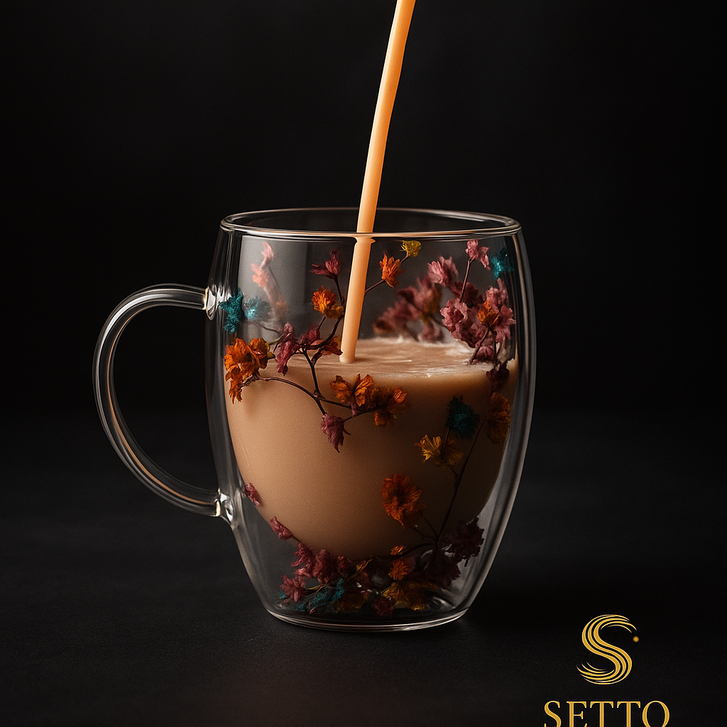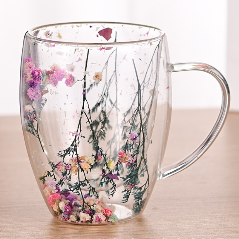 Elegant double-wall glass mug filled with real dried flowers for a natural and artistic look.