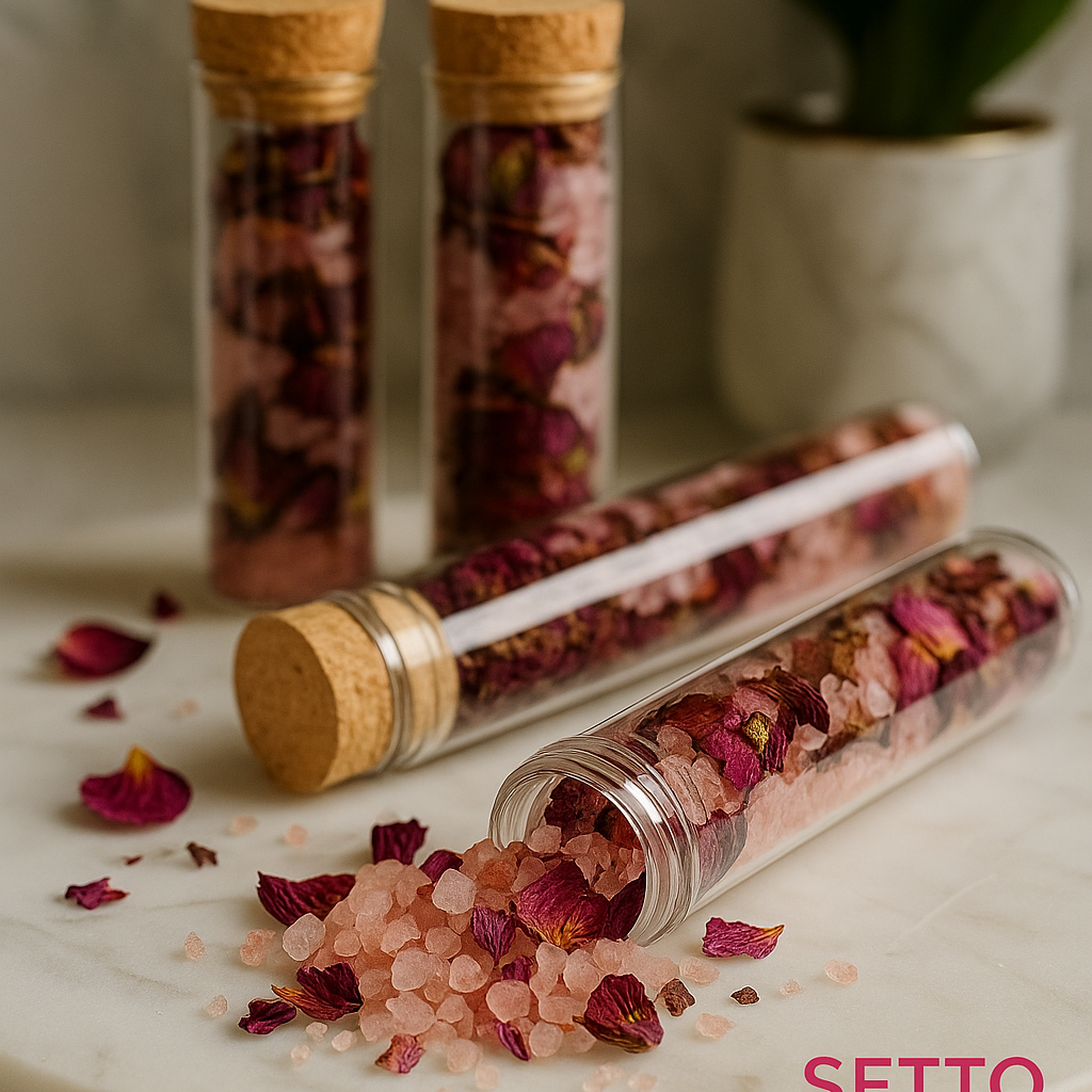 Each glass tube is filled with mineral-rich pink sea salt and dried rose petals, creating a perfect balance between beauty and wellness.