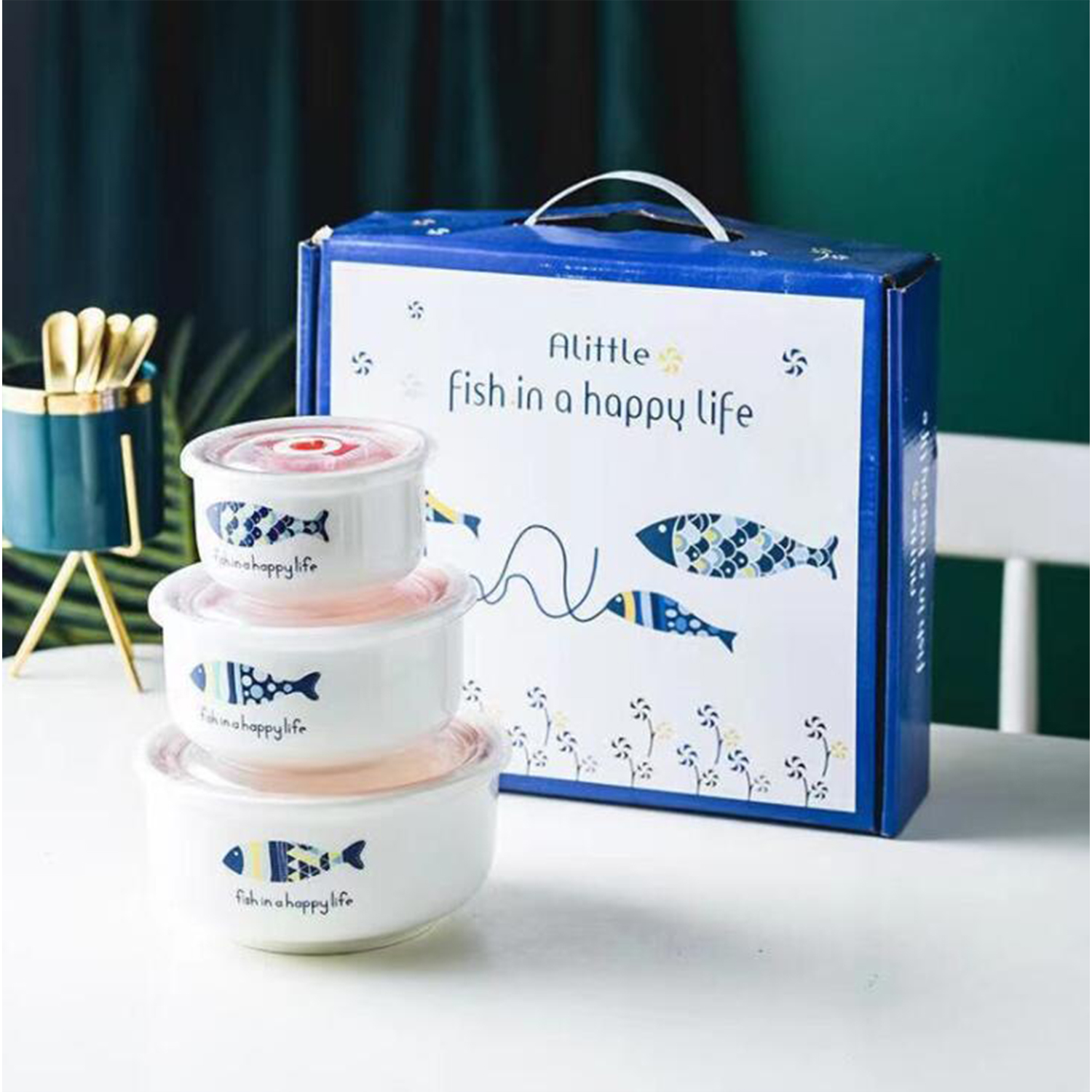 A charming 3-piece ceramic bowl set with sealing lids — perfect for storing or serving food.